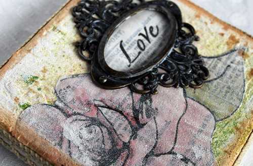 I used some vintage newspaper, gesso, modeling paste and You’re so fine glitter in layers. I did some splashing too. :)